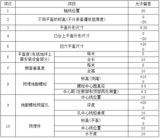 油罐和液化石油氣罐安裝就位后,由多個(gè)獨(dú)立基礎(chǔ)組成的設(shè)備基礎(chǔ),各個(gè)基礎(chǔ)間的軸線、標(biāo)高等的允許偏差應(yīng)按下表的規(guī)定進(jìn)行注水沉降。