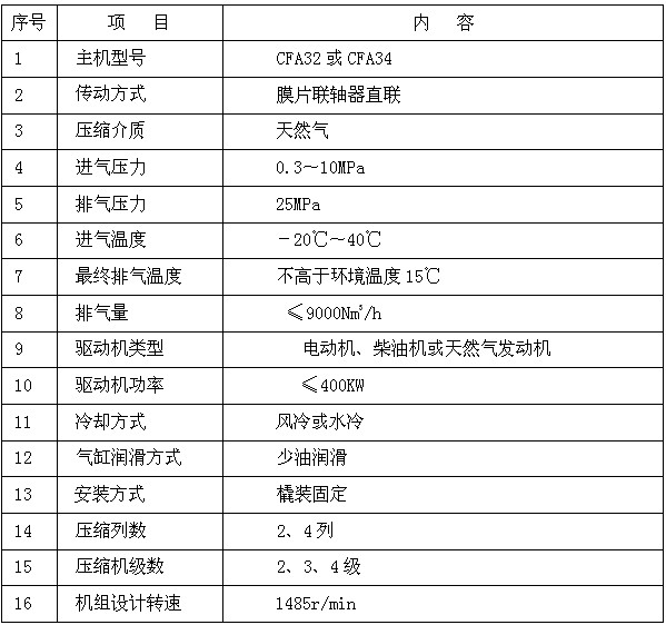 一、 概述 武漢齊達(dá)康環(huán)??萍加邢薰?/a>擁有一支訓(xùn)練有素的專業(yè)技術(shù)隊(duì)伍,掌握著壓縮機(jī)及汽車發(fā)展的信息及前沿技術(shù),能研發(fā)具有國(guó)際同類產(chǎn)品選進(jìn)水平的增壓系統(tǒng)。主要技術(shù)骨干有二十年以上從事壓縮機(jī)主機(jī)及配套設(shè)計(jì)經(jīng)驗(yàn),能根據(jù)客戶的需求設(shè)計(jì)制造不同用途的空氣、氮?dú)饧疤烊粴鈮嚎s機(jī)。公司于2013年與美國(guó)卡麥?。–ameron)公司簽訂了壓縮機(jī)成橇商協(xié)議。目前,進(jìn)口世界一流的Cameron公司壓縮機(jī)主機(jī),研發(fā)具有國(guó)際先進(jìn)水平的CNG母站和常規(guī)站。實(shí)現(xiàn)了機(jī)電一體化,具有安全性、可靠性和無(wú)故障運(yùn)行時(shí)間長(zhǎng)等特點(diǎn),可替代同類進(jìn)口產(chǎn)品。 二、 主要特點(diǎn) 1、 模塊化、變工況設(shè)計(jì),完全平衡型結(jié)構(gòu) 通過(guò)機(jī)身、氣缸及余隙的組合,能滿足參數(shù)范圍內(nèi)的全部工況要求,適應(yīng)性廣,機(jī)組振動(dòng)小。 2、 轉(zhuǎn)速高、體積小、重量輕、結(jié)構(gòu)緊湊 橇裝機(jī)組占地小,零部件重量輕,維修方便。 3、 氣缸自然冷卻,機(jī)組可實(shí)現(xiàn)全風(fēng)冷,無(wú)需水系統(tǒng) 4、 主油泵置于機(jī)身內(nèi),由曲軸驅(qū)動(dòng),無(wú)需另外配置防爆電機(jī),無(wú)漏油現(xiàn)象。 5、 氣缸采用集中式分配潤(rùn)滑,氣缸及填料潤(rùn)滑油量由分配塊自動(dòng)分配,配置無(wú)流量檢測(cè)開(kāi)關(guān),潤(rùn)滑可靠。注油泵二個(gè),數(shù)量少。注油器由曲軸通過(guò)鏈條驅(qū)動(dòng),安裝于機(jī)身上,結(jié)構(gòu)緊湊,無(wú)需防爆電機(jī)。 6、 產(chǎn)品結(jié)構(gòu)緊湊、安全可靠性高、無(wú)故障時(shí)間長(zhǎng)。 氣閥、填料、活塞環(huán)等易損件壽命8000小時(shí),注油泵16000小時(shí),主軸瓦、連桿瓦及襯套等40000小時(shí)。 7、 PLC控制系統(tǒng),中文界面,記錄歷史數(shù)據(jù)及故障原因,高度自動(dòng)化,可實(shí)現(xiàn)無(wú)人值守。 8、 國(guó)內(nèi)配套,進(jìn)口品質(zhì),性價(jià)比高,且可享受國(guó)內(nèi)優(yōu)質(zhì)服務(wù)。 三、 機(jī)組主要技術(shù)參數(shù)