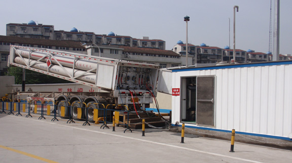 當前國內(nèi)天然氣子站建設中,壓縮機設備有部份選用的是液壓平推式子站設備系統(tǒng),由專用槽車、液壓工作橇、售氣機等組成。其工作原理是:液壓工作橇提供高壓油,通過一系列控制閥逐次注入專用槽車的每只長管鋼瓶內(nèi),將長管鋼瓶內(nèi)的天然氣以20MPA的恒定壓力推出來,從而通過售氣機給汽車加氣。如下圖:左邊是專用槽車,右邊是液壓工作撬。