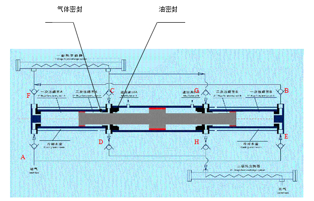 結(jié)構(gòu)原理:中間一個(gè)油缸帶動(dòng)兩邊的兩個(gè)氣缸,每個(gè)氣缸分為兩級(jí)壓縮。如下圖。
