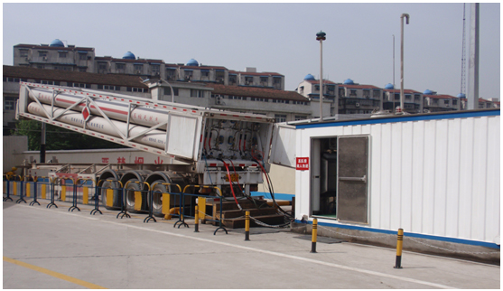 液壓平推設(shè)備系統(tǒng)工藝的CNG加氣子站,由專(zhuān)用槽車(chē)、液壓工作橇、售氣機(jī)等組成。其工作原理是:液壓工作橇提供高壓油,通過(guò)一系列控制閥逐次注入專(zhuān)用槽車(chē)的每只長(zhǎng)管鋼瓶?jī)?nèi),將長(zhǎng)管鋼瓶?jī)?nèi)的天然氣以20MPa的恒定壓力推出來(lái),從而通過(guò)售氣機(jī)給汽車(chē)加氣。如下圖:左邊是專(zhuān)用槽車(chē),右邊是液壓工作撬。