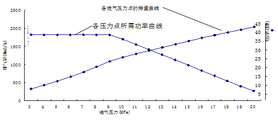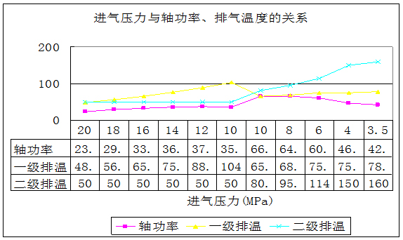 (4)能耗較大。選用電機(jī)功率較大(75kW或90kW),啟動(dòng)電流也大。因此不能頻繁啟動(dòng)。下圖是槽車(chē)壓力與軸功率和排氣溫度曲線(xiàn)。從圖線(xiàn)可以看出,槽車(chē)壓力在10MPa時(shí),功率較大,其它壓力段的無(wú)功損耗較多,并且,為了保證電機(jī)在空負(fù)荷下啟動(dòng),在停機(jī)時(shí)要將氣缸及管線(xiàn)內(nèi)的氣體放空。