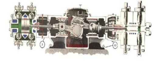 其傳動(dòng)模式是:電機(jī)帶動(dòng)曲軸旋轉(zhuǎn),通過(guò)連桿、十字頭、活塞桿,帶動(dòng)活塞在氣缸內(nèi)作往復(fù)運(yùn)動(dòng),實(shí)現(xiàn)氣體的壓縮過(guò)程,實(shí)現(xiàn)增壓目的。如下圖: