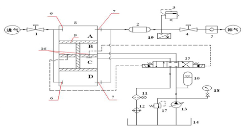結(jié)構(gòu)原理:工字形活塞桿將上面氣缸分隔為A、B兩個(gè)腔,將下面氣缸分隔為C、D兩個(gè)腔,如下圖: