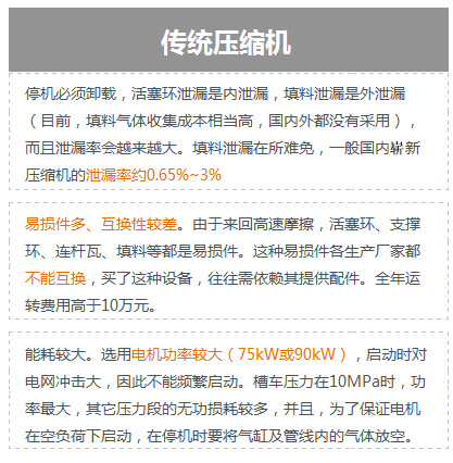 (5)維護(hù)費(fèi)用高。易損件多、互換性較差。由于來(lái)回高速摩擦,活塞環(huán)、支撐環(huán)、連桿瓦、填料等都是易損件。這種易損件各生產(chǎn)廠家都不能互換,買(mǎi)了這種設(shè)備,往往需依賴(lài)其提供配件。